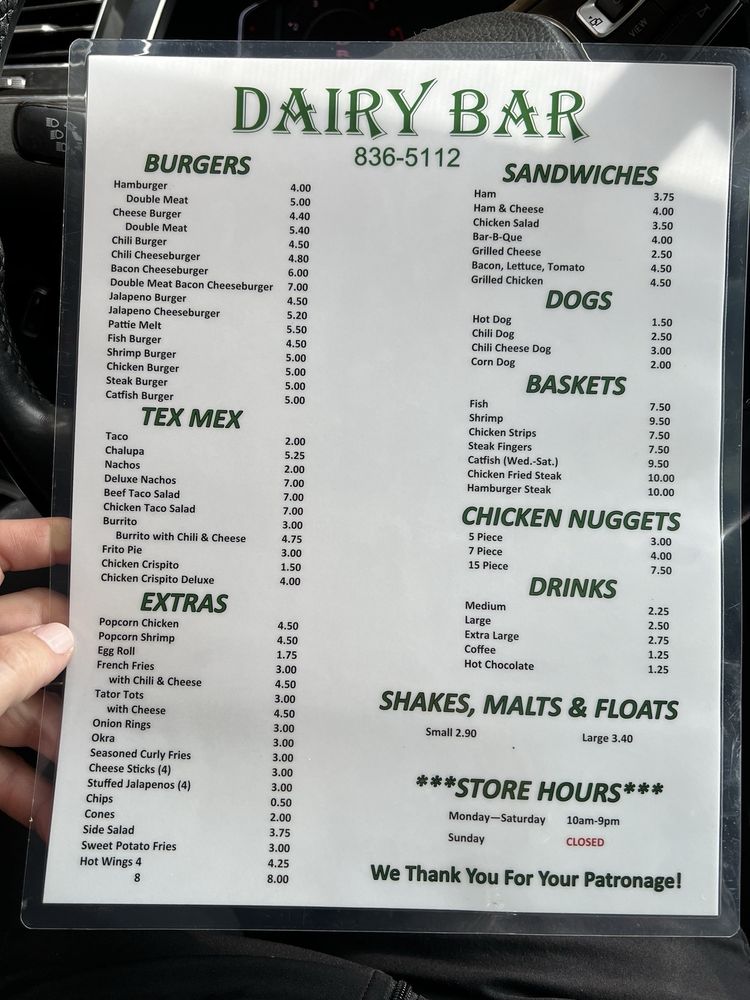Introducing the menu at Dairy Bar in Brenham, TX, where burgers are the star of the show. With rave reviews on the quality and price of their food, Dairy Bar offers a variety of options for all preferences, including vegetarian choices. From classic burgers to patty melts and chili cheese tots, customers are impressed with the hearty portions and affordable prices. The laid-back atmosphere, quick service, and delicious milkshakes add to the charm of this small-town gem. Whether you're looking for a quick lunch or a family-friendly dinner spot, Dairy Bar provides a satisfying meal that won't break the bank. Don't miss out on their signature dishes like the steak fingers with cream gravy and the bacon cheeseburger with sweet potato fries. Experience the old school burger stand vibe and indulge in a taste of nostalgia at Dairy Bar.